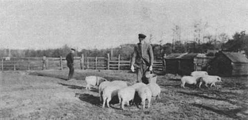 | Bijschrift: "Varkensvoederen op een boerderij bij Rijperskerk. De 'bargen oan'e trôge'." |