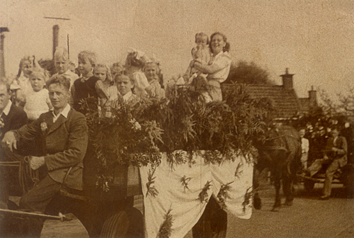 | 23 augustus 1950. Optocht door het dorp, de voorste wagen wordt gemend door Roel Riedstra. |